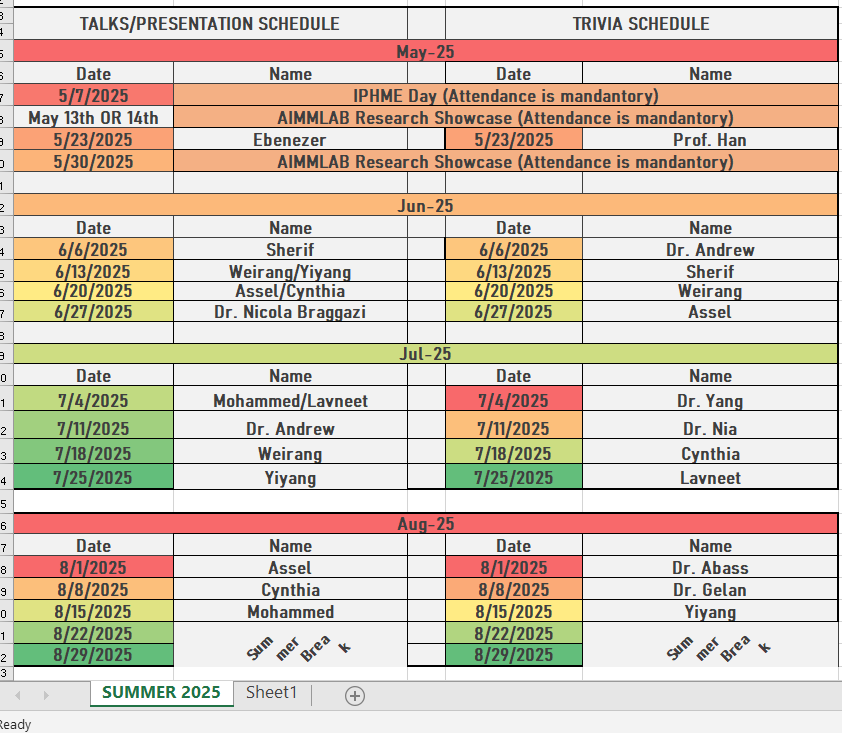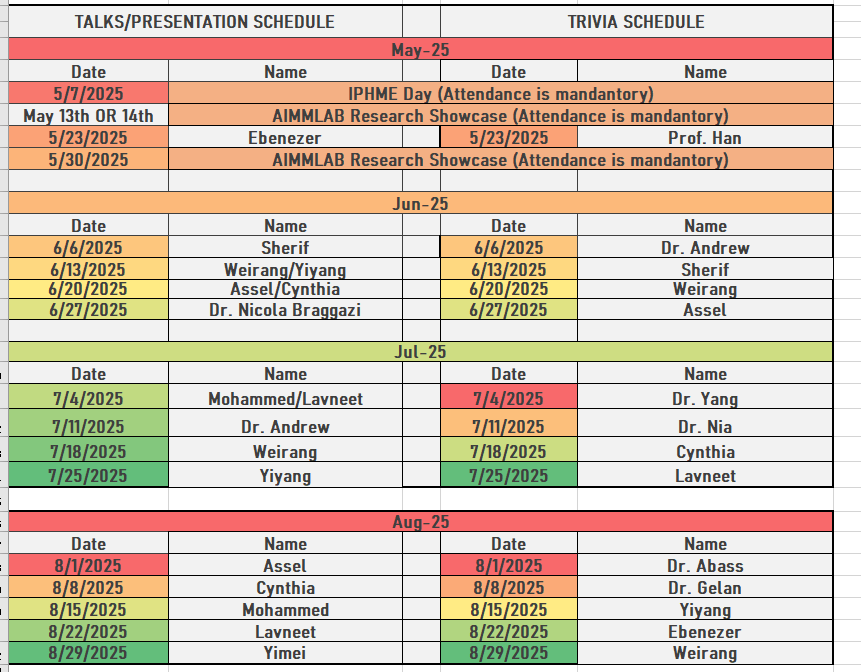 Join us for our weekly AIMMLab meetings where creativity and innovation meet in a collaborative environment. Each session is an opportunity to engage with groundbreaking research presentations and enjoy interactive trivia that makes learning fun. These meetings are a perfect chance to connect, discuss, and explore the diverse applications of AI and mathematical modeling in solving real-world challenges.