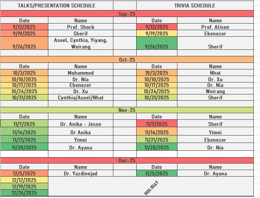 Lab meetings for Fall 2025 will take place on Fridays from 1:00 pm to 3:00 pm EST.